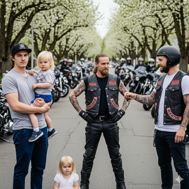 Do lado de fora da pequena casa alugada de Adam. Mais de 40 motocicletas enfileiradas na calçada como cavalos de aço. Cromados brilhavam sob o sol da manhã. Jaquetas exibiam insígnias desconhecidas para a maioria, mas instantaneamente reconhecíveis para aqueles que conheciam as ruas. Adam estava parado na porta, protegendo Lily atrás de si. Suas mãos tremiam levemente, não de medo, mas por não saber o que era aquilo.