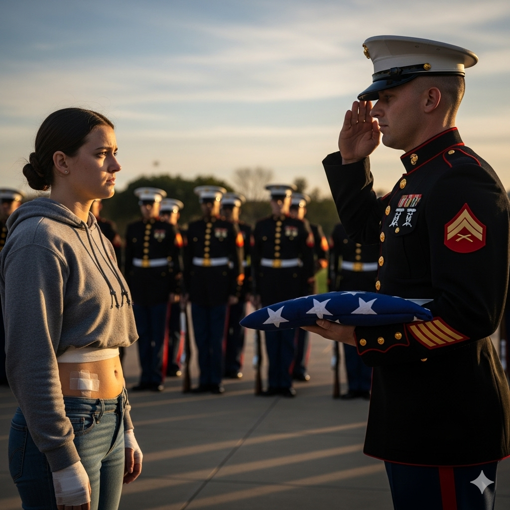 O fuzileiro estava deitado, com os olhos trêmulos. Ela pressionou as duas mãos contra o flanco dele, tentando manter a pressão sobre o sangramento. “Eu te peguei”, sussurrou. “Fique comigo.” O mundo girou. Sirenes finalmente soaram ao longe. Alguém correu para o lado dela. Outro PEM de folga, como ela, oferecendo ajuda. Mãos substituíram as dela e o peito do fuzileiro.