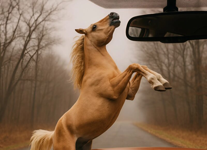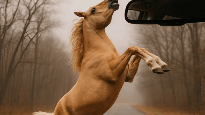 À minha frente, empinado nas patas traseiras, estava o cavalo. Ele bufava, batia no asfalto com os cascos e olhava através do para-brisa como se estivesse tentando me impedir. Meu coração batia tão forte que não ousei sair a princípio. Mas o cavalo claramente não ia fugir — estava nervoso e parecia tentar dizer alguma coisa.