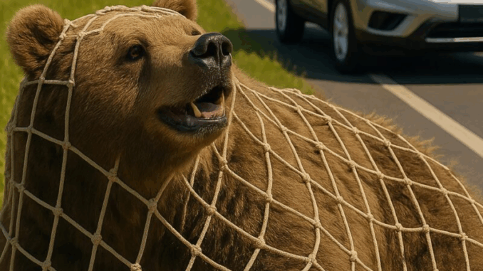 Pisei no acelerador instintivamente, mas, olhando mais de perto, percebi: o urso não estava apenas sentado ali — estava preso em uma grande rede. As cordas apertavam seus ombros e patas, seu pelo estava emaranhado e o animal respirava pesadamente, rosnando como se pedisse socorro.