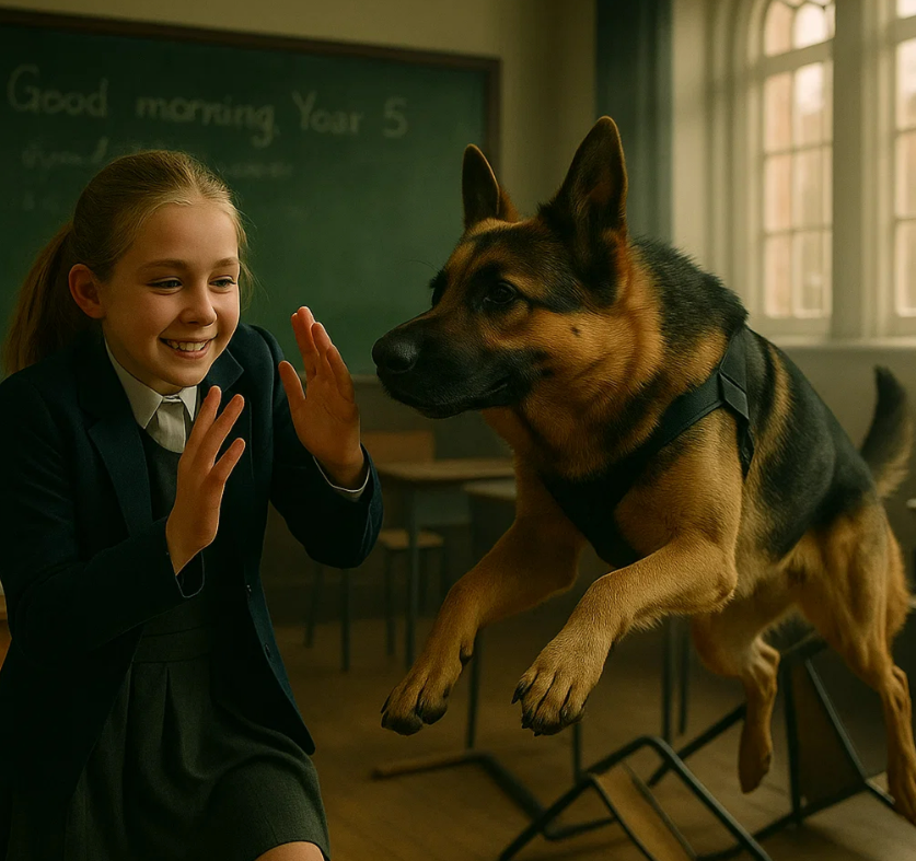 O pastor alemão investiu contra uma garota na terceira fileira, latindo alto. Ela era uma aluna modesta e quieta chamada Marie — geralmente sentava-se nas últimas fileiras. Hoje, ela estava ao lado das amigas, segurando um caderno contra o peito. À primeira vista, parecia uma garota comum e tímida.