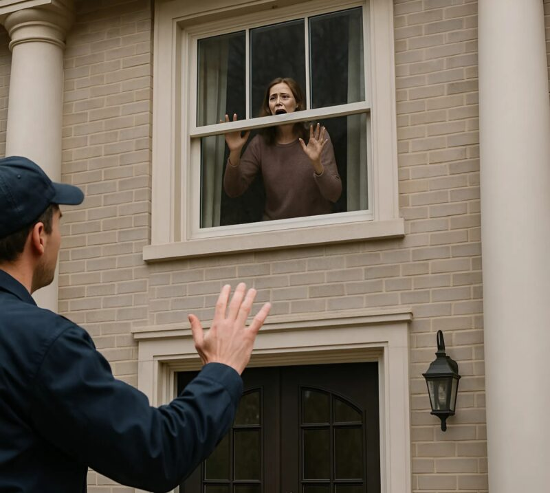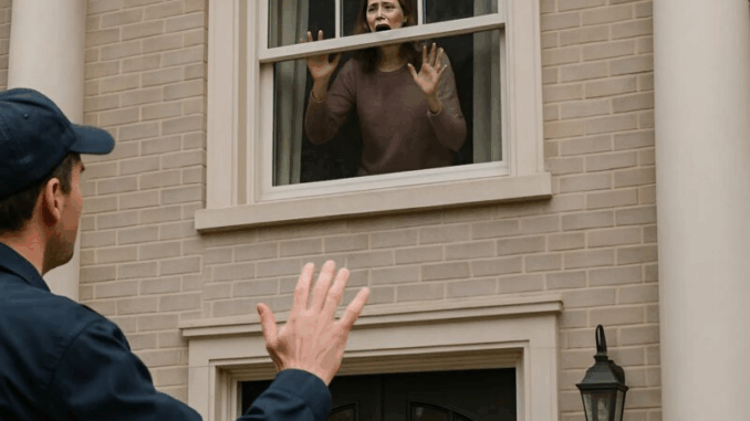 Na janela estava uma mulher de cerca de quarenta anos. Ela o encarava fixamente. O mensageiro instintivamente levantou a mão, pensando que ela estava apenas o cumprimentando. Mas seus gestos não eram uma saudação. Ela batia as palmas das mãos no vidro, agitava os braços desesperadamente e gritava algo enquanto pressionava o rosto contra a janela.