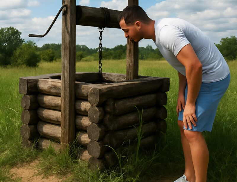 Acontece que, enquanto eu lia e minha esposa estava ocupada com suas tarefas, ele havia saído silenciosamente para o quintal. Ele se aproximou do poço para ver o que havia dentro – e não percebeu como foi parar lá dentro.