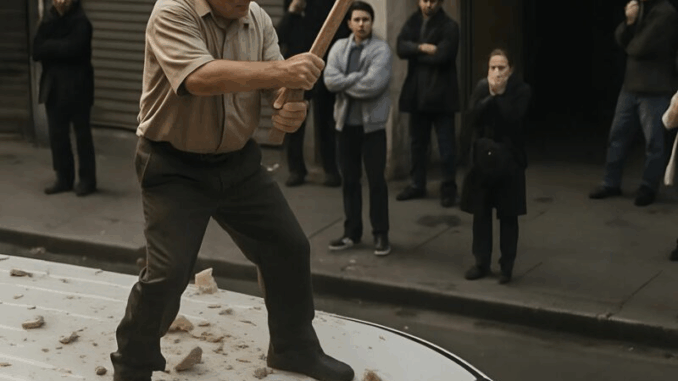 Em uma rua estreita do bairro antigo, um som agudo e abafado ecoou de repente, como se alguém tivesse golpeado uma chapa de metal grossa com uma força incrível. Os transeuntes se assustaram e se viraram. A origem do ruído era óbvia: no teto de uma van branca, um homem idoso de cabelos grisalhos segurava uma marreta pesada com as duas mãos.