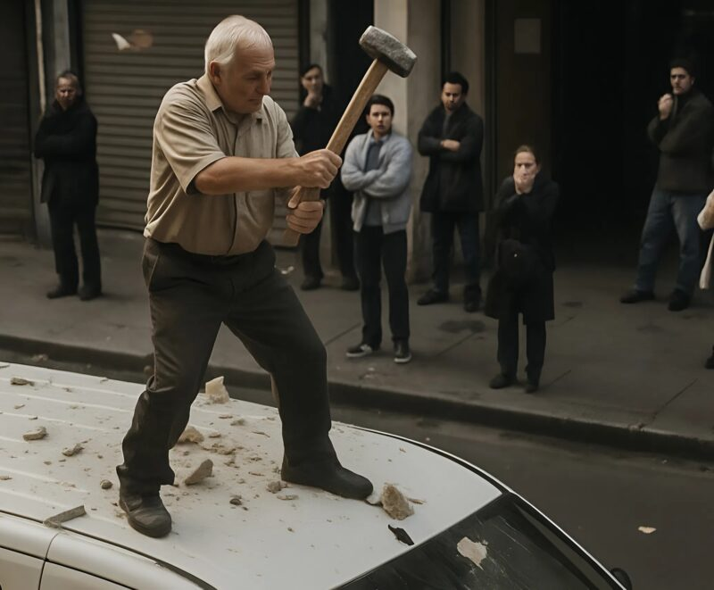 As pessoas paralisaram em espanto – e o horror em seus olhos crescia a cada golpe. O metal sob seus pés dobrava e rangia, o teto já estava coberto de amassados profundos, e pedaços de tinta e metal voavam sobre o asfalto. O para-brisa da van, antes intacto, agora apresentava rachaduras, e a cada golpe da marreta, estilhaçava-se em pedacinhos. Cada novo golpe era acompanhado por um som metálico, um baque surdo e um eco que se espalhava pela rua.
