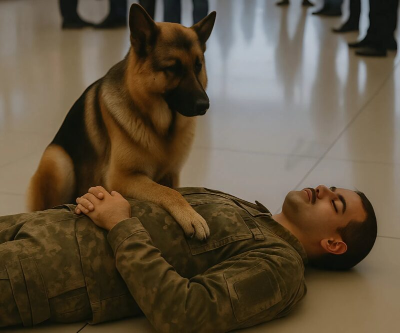 No aeroporto, as pessoas notaram um soldado deitado no chão frio, com um pastor alemão sentado ao lado, latindo para os transeuntes: a multidão ficou horrorizada ao perceber o motivo do comportamento estranho do cão.