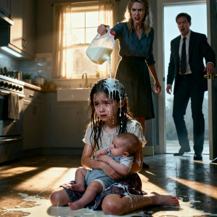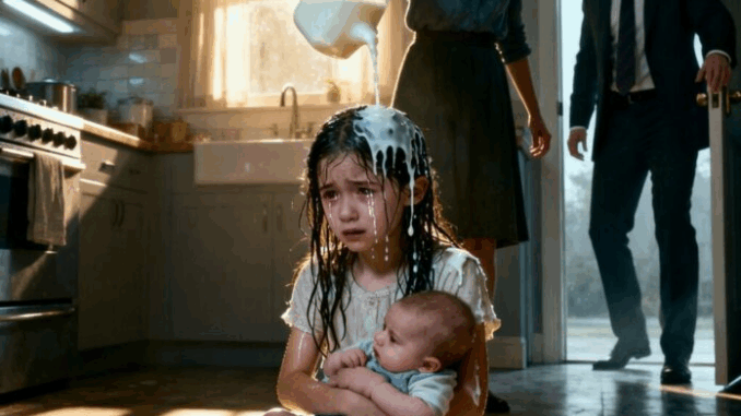 Emily estava agachada no chão de azulejos, com leite escorrendo pelos cabelos, o vestido encharcado e poças se formando ao redor dos joelhos. Ela abraçava Alex com força contra o peito, o rostinho dele enterrado em seu ombro. Acima deles, Vanessa, com uma expressão despedaçada transformada em raiva, segurava a jarra de leite vazia como se fosse uma arma.
