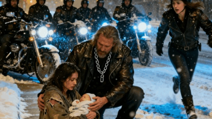 Da escuridão além da rua, o rugido dos motores interrompeu o silêncio. Dez motocicletas surgiram, os faróis cortando a nevasca. Os olhos de Vanessa se arregalaram. Seus lábios mal se moveram. “Por favor… alguém… ajude-a…”, implorou ela.