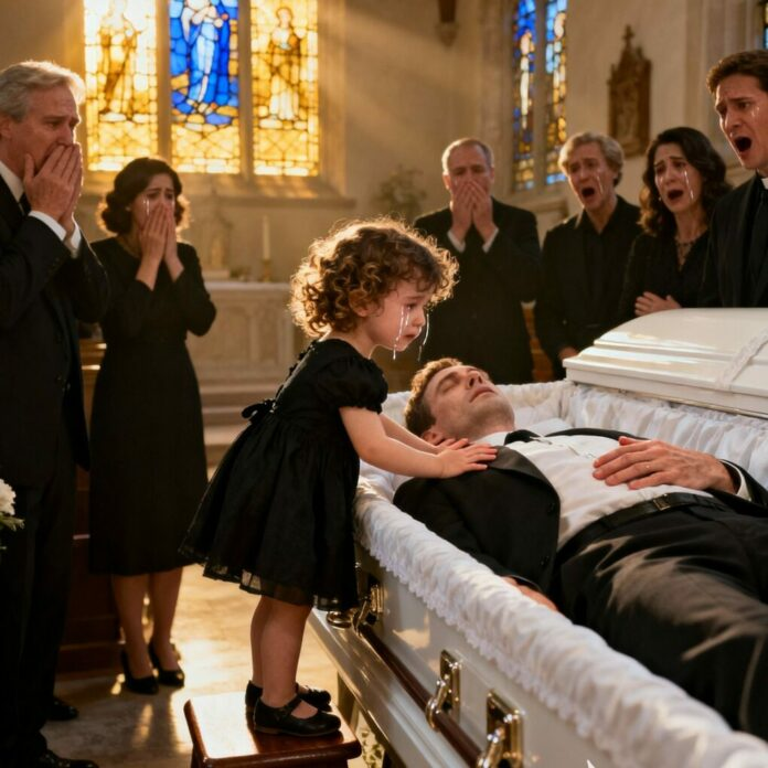 Quando o pastor começou o elogio fúnebre, Ella deslizou da cadeira, seus sapatos de verniz tilintando contra o piso de mármore. A multidão silenciou. Ela subiu em um pequeno banquinho ao lado do caixão, estendendo a mão para tocar a mão do pai.