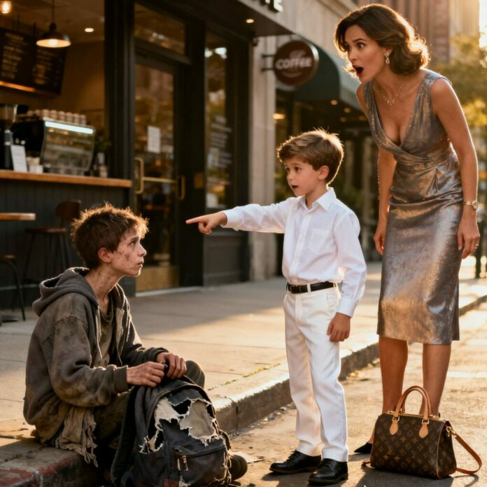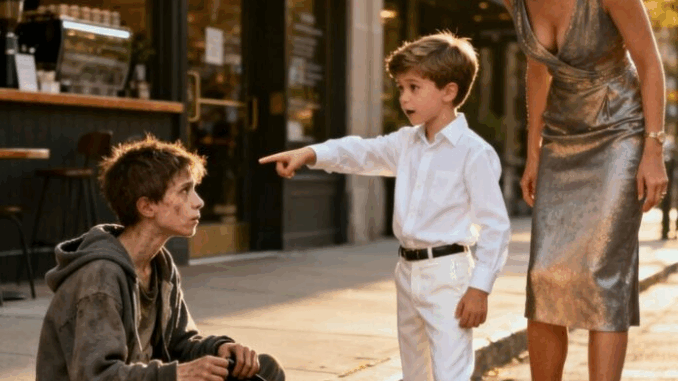 “Ethan, não aponte”, ela sussurrou, tentando puxá-lo. “Vamos, querido.”