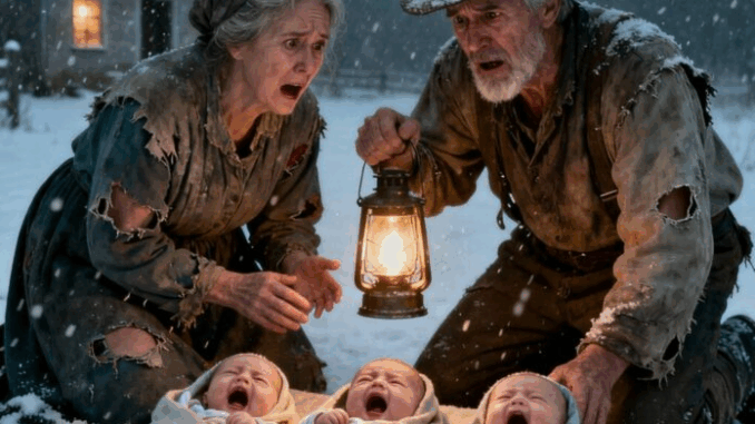 Mark pegou o casaco e a lanterna, saindo para a tempestade congelante. A luz atravessou a neve em feixes trêmulos até iluminar uma pequena cesta de vime ao lado do portão. Ellen correu atrás dele, com o coração disparado. Dentro da cesta estavam três recém-nascidos , enrolados em cobertores finos já úmidos de neve. Seus rostinhos estavam vermelhos e trêmulos.