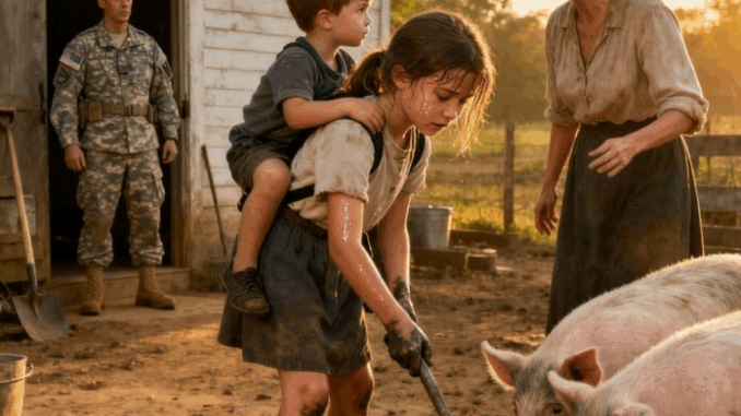 Emily, com apenas nove anos, estava lá dentro, tentando levantar um pesado balde de feno enquanto carregava Joshua, de três anos, nas costas. Suas mãozinhas estavam rachadas, seu suéter grande demais e imundo. Joshua se agarrava a ela como se tivesse medo de soltá-la. Max estava perto deles, protegendo-os e latindo agudamente como se os defendesse do próprio mundo.