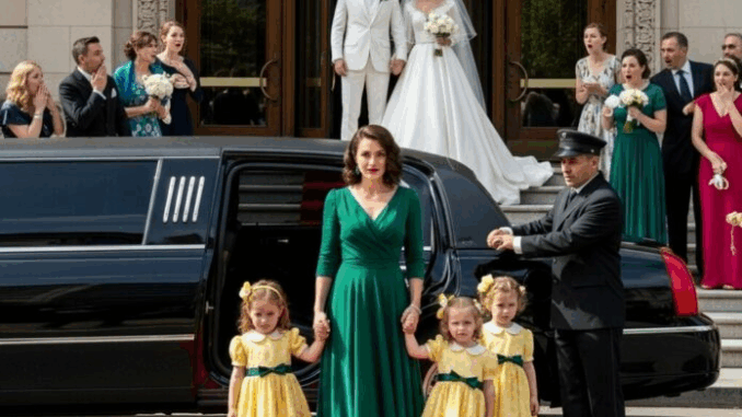 O carro preto parou. O motorista saiu, abrindo a porta com uma graça prática. Primeiro vieram três meninas com vestidos amarelos iguais, de mãos dadas, seus cachos balançando enquanto caminhavam pelo tapete vermelho. Atrás delas surgiu Emma, vestindo um elegante vestido verde-esmeralda. Sua presença era imponente, porém serena, sua beleza radiante e sua força inegável.