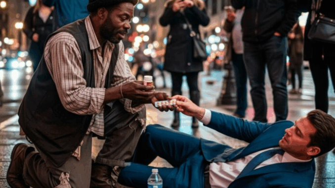 As luzes da cidade brilhavam acima dele, indiferentes à sua fome. Marcus estava sentado perto da entrada do metrô, com um copo de papel ao lado, quando uma comoção irrompeu na esquina. Um homem bem vestido, de terno azul-marinho, cambaleou, agarrando a garganta. Sua pasta caiu, espalhando papéis pelo pavimento molhado.