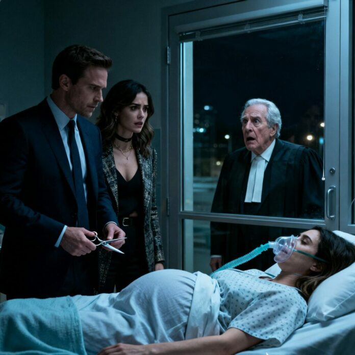 Agora, sob a luz tênue da UTI, Edward aproximou-se da cama. O suave chiado do concentrador de oxigênio preenchia o silêncio. Ele enfiou a mão no bolso e tirou uma tesoura cirúrgica. Sua mão tremia, não de culpa, mas de medo de ser descoberto. “Você finalmente descansará em paz”, sussurrou. Com um movimento rápido, cortou o tubo de oxigênio. O monitor disparou alarmes e luzes vermelhas piscaram por todo o quarto. O corpo de Isabella se contraiu enquanto ela lutava para respirar. Edward congelou. Não esperava que fosse tão alto.