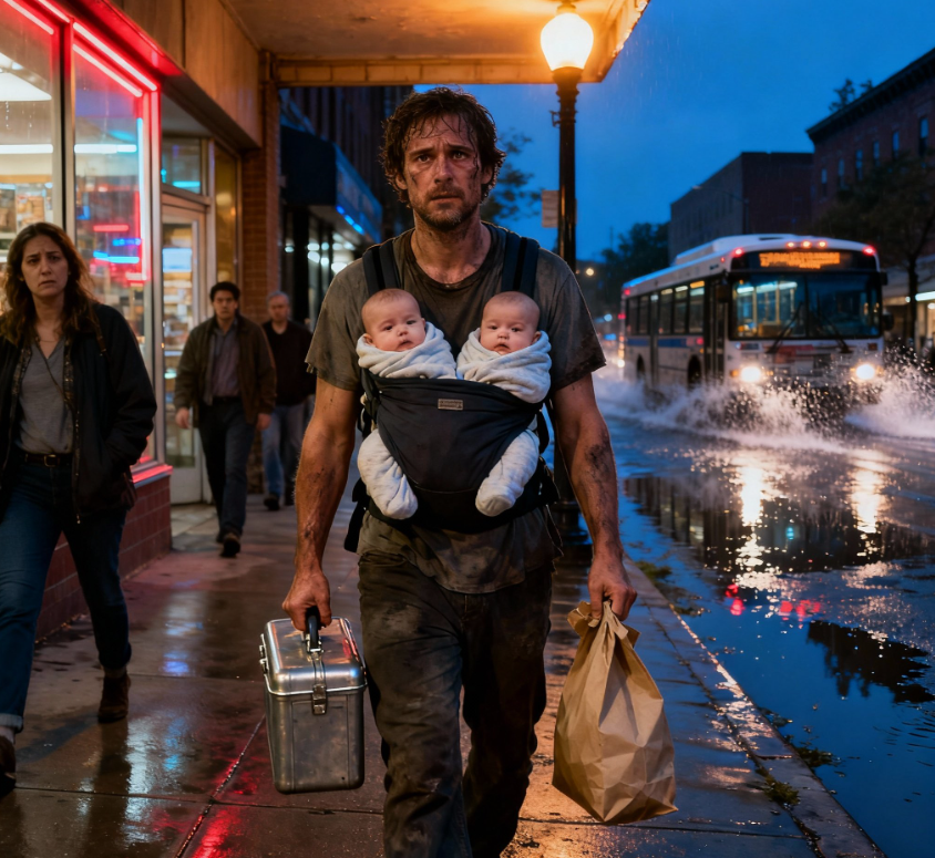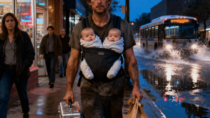 As luzes da cidade tremeluziam contra um céu cinzento de novembro enquanto Daniel Brooks caminhava penosamente pela calçada rachada, uma mão segurando uma caixa de ferramentas amassada, a outra uma fina sacola plástica de supermercado. Presos ao peito estavam seus filhos gêmeos, Matthew e Michael — de seis meses, macios e dormindo, suas cabecinhas encostadas em sua jaqueta de trabalho desbotada.