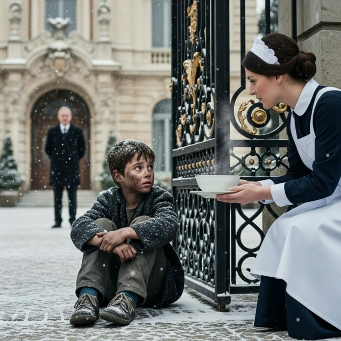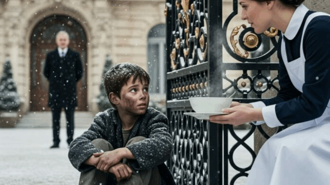 O eco de seus sapatos lustrados no piso de mármore ficou mais alto. Ele entrou na cozinha, esperando silêncio — apenas para encontrar Claire parada rigidamente e um menino maltrapilho devorando comida de uma tigela de porcelana.