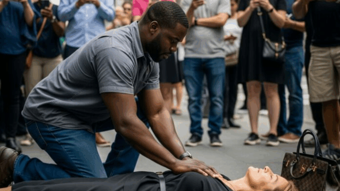 Uma mulher na casa dos cinquenta anos jazia estirada na calçada, sua bolsa de grife aberta, as joias brilhando ao sol. A multidão congelou. As pessoas olhavam boquiabertas, os celulares pairando no ar, gravando em vez de reagir. O coração de James disparou. Ele largou a mochila e abriu caminho.