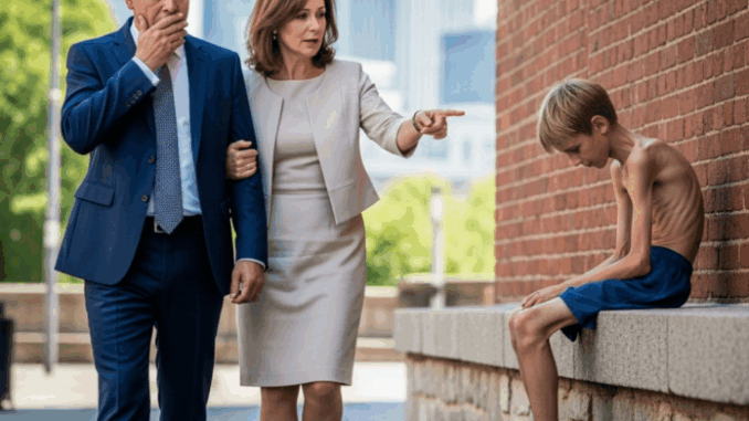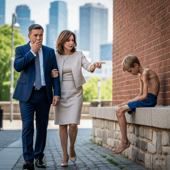 Mas, a meio caminho da calçada de tijolos, Victoria parou abruptamente, seus dedos bem cuidados apertando o braço de Marcus. Seus olhos se fixaram em um menino frágil e descalço, sentado sozinho na mureta de pedra encostada em um alto prédio de tijolos vermelhos. Seus joelhos estavam encolhidos, seus braços finos estendidos sobre eles, e seus olhos — fundos, porém penetrantes — fitavam o chão.