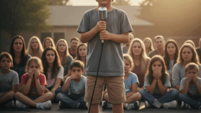 O microfone parecia pesado nas pequenas mãos de Marcus, mas o peso não era medo — era responsabilidade. Ele olhou para os sapatos surrados em seus pés, aqueles com cadarços desfiados e buracos perto dos dedos. Seu peito apertou, mas então ele se lembrou da voz de seu pai: “Seja corajoso, filho.”