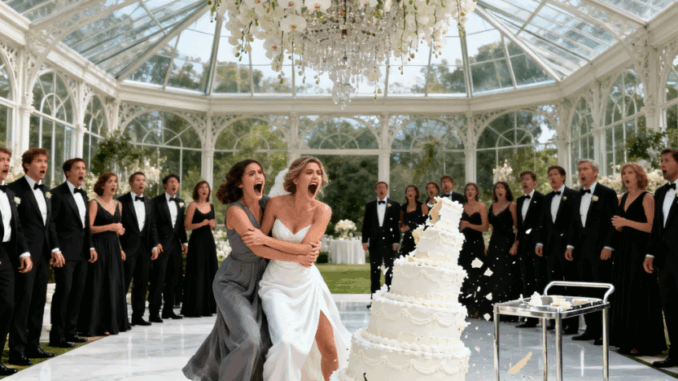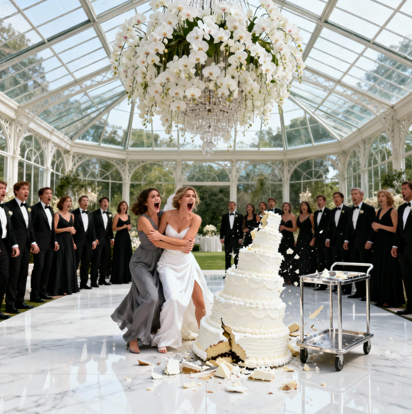 O som foi cataclísmico. A torre de sete andares oscilou por um segundo e então desabou sobre o piso de mármore. A porcelana se estilhaçou. Camadas de bolo e creme explodiram para fora, respingando nos convidados da primeira fila. Folhas de ouro e glacê branco cobriram meu vestido e o smoking caro de David.