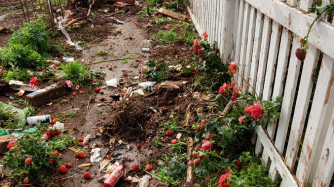 “O jardim. Tudo o que plantamos. Tudo destruído. Arrancado… esmagado. Há lixo por toda parte. Está tudo simplesmente—”