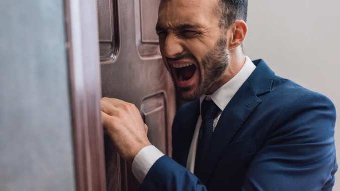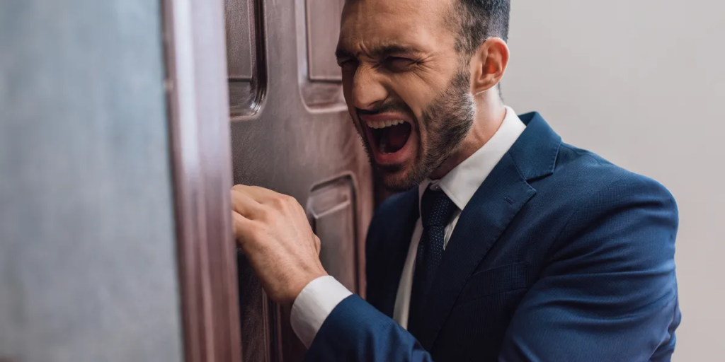 Um homem furioso parado na varanda da frente de sua casa | Fonte: Midjourney