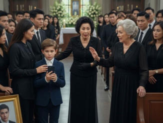 No funeral do meu marido, a mãe dele olhou diretamente para mim e disse friamente: “É melhor que ele se vá agora do que ser obrigado a conviver com a vergonha que ela lhe causou.” Alguns parentes assentiram, sussurrando em aprovação. Antes que eu pudesse responder, meu filho de oito anos se levantou da cadeira, agarrando o celular do pai com as duas mãos. “Vovó”, disse ele com voz firme, “quer que eu toque a gravação que o papai fez sobre você semana passada?” A expressão dela se desfez instantaneamente — o sangue sumiu do seu rosto enquanto o silêncio tomava conta do ambiente.